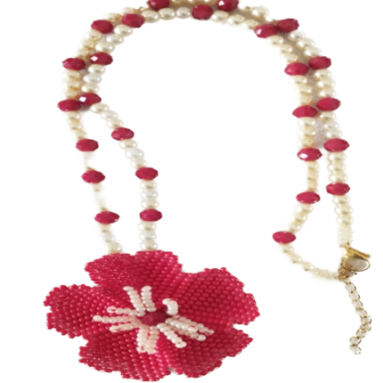 Collar elaborado a mano en perlas y murano, flor en mostacilla checa, terminales en acero.