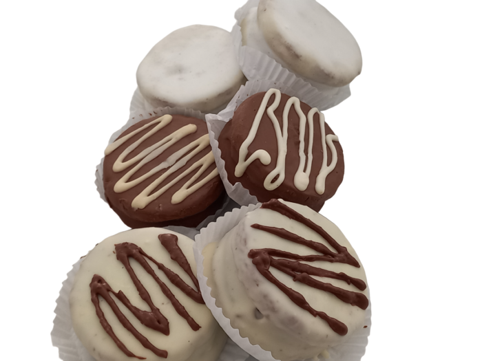 Galleta rellena de arequipe, arequipe chocolate, arequipe cafe; cubierta de chocolate blanco, negro y merengue horneado.