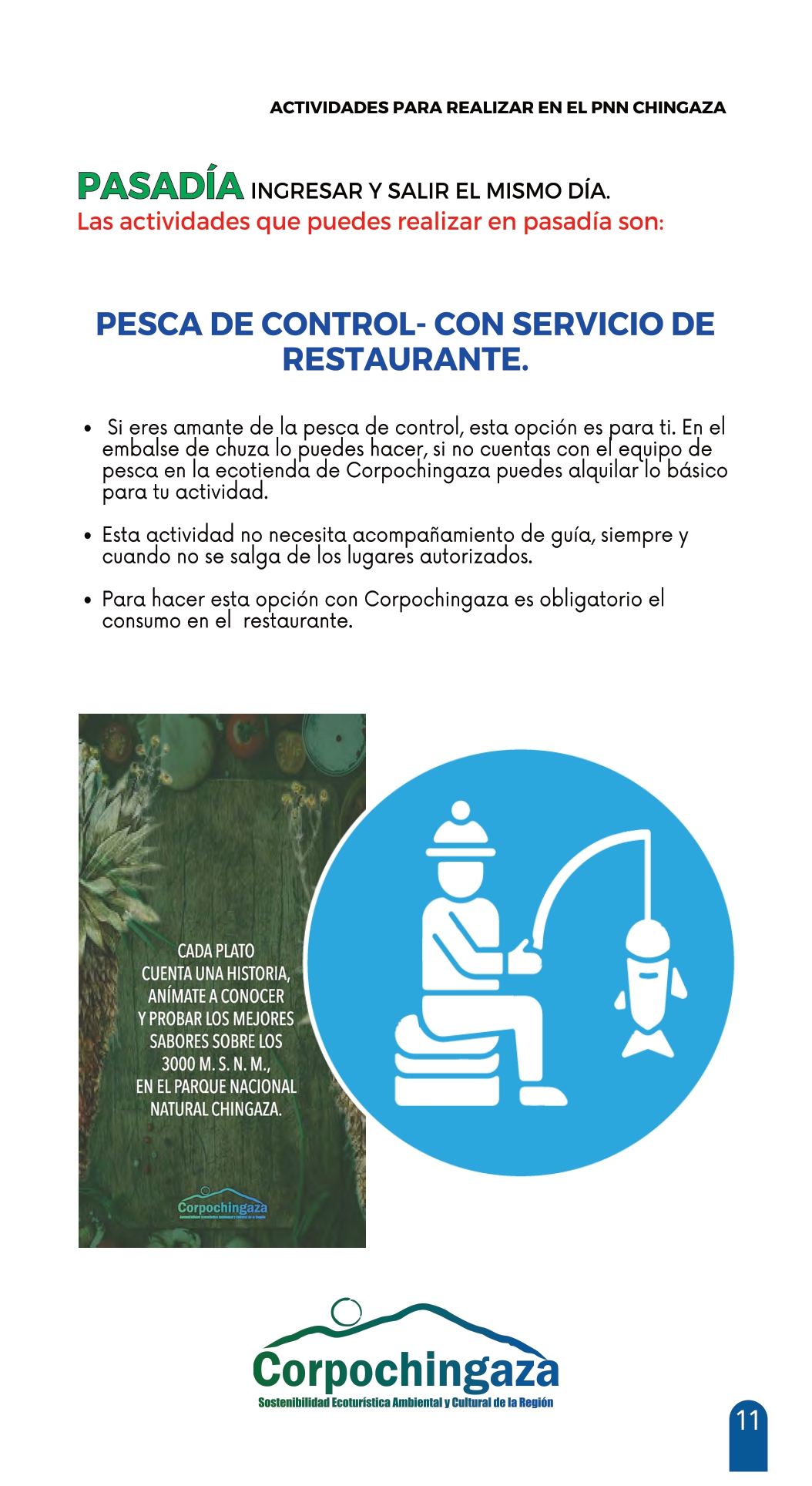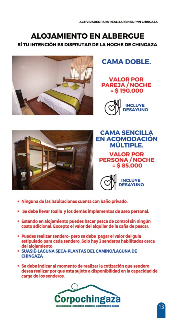 Corpochingaza ofrece un albergue con la opción de elegir entre camas dobles y sencillas en acomodación múltiple. Es importante destacar que en este tipo de alojamiento, los baños son compartidos, divididos en baños separados para mujeres y hombres. Además, al hospedarse en el albergue, los visitantes tienen la oportunidad de realizar pesca de control sin ningún costo adicional, a excepción del alquiler de la caña de pescar.