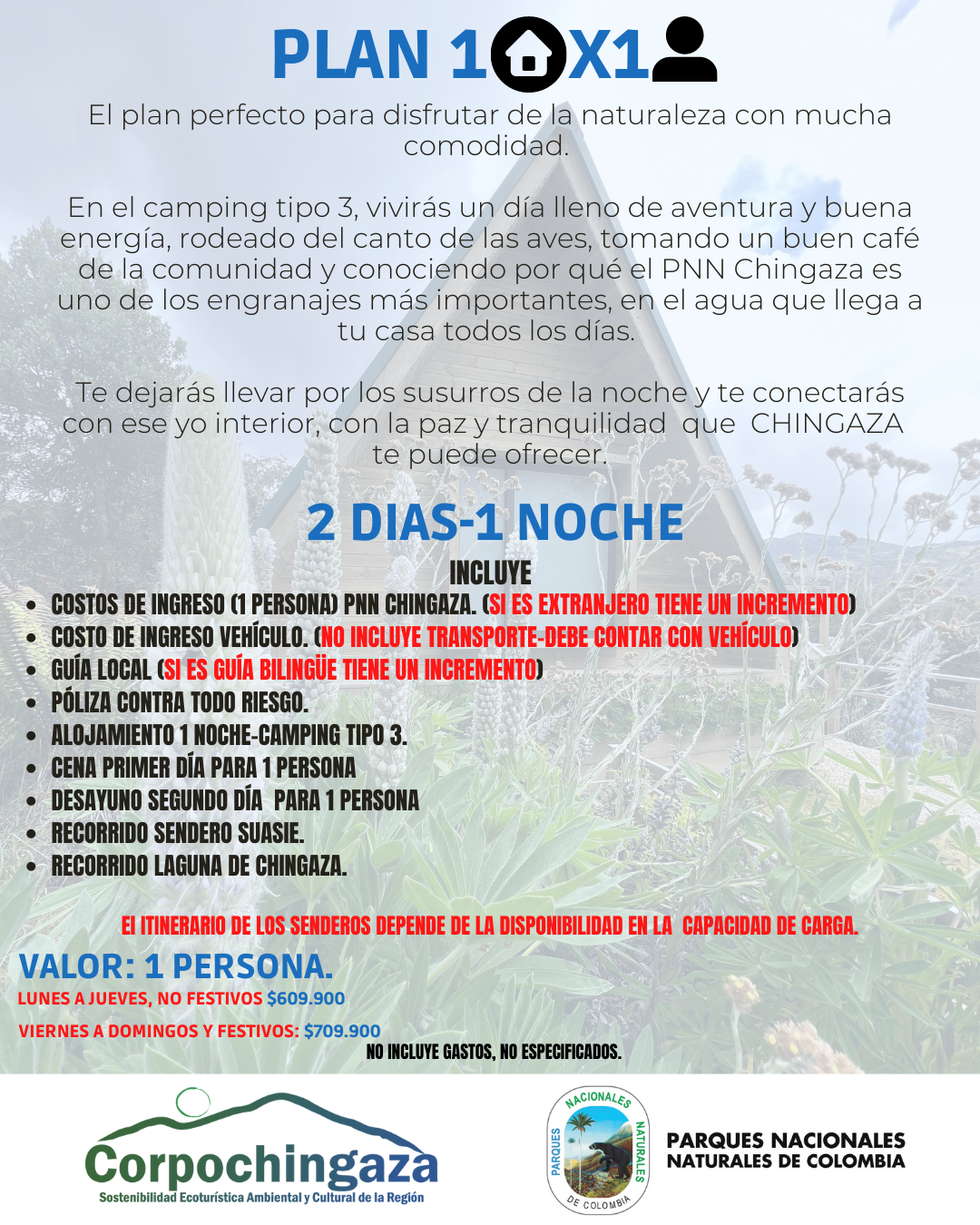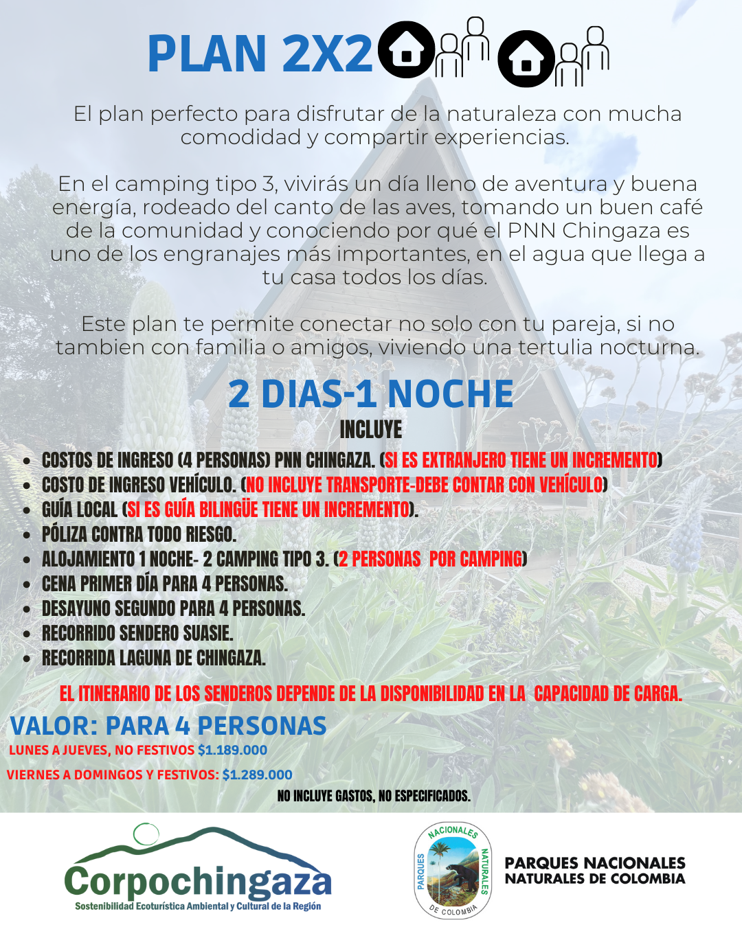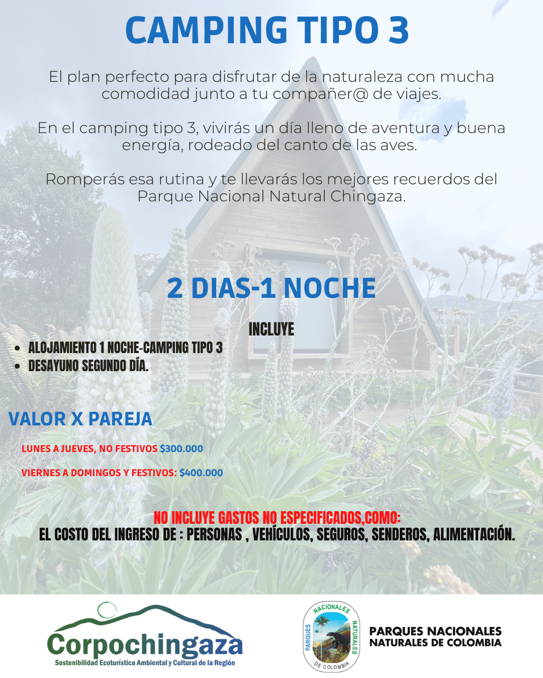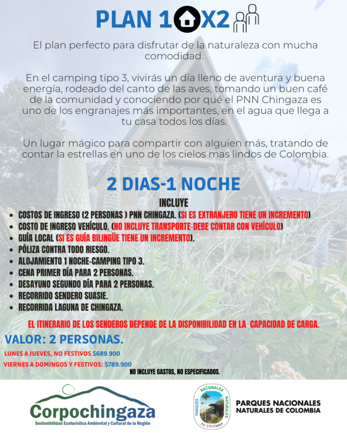 Para cualquiera de los planes el check-in será a las 2:00 pm y el check – out a las 11:00 am. Los precios de los planes para alojamiento camping tipo 3, varían para fin de semana y entre semana |