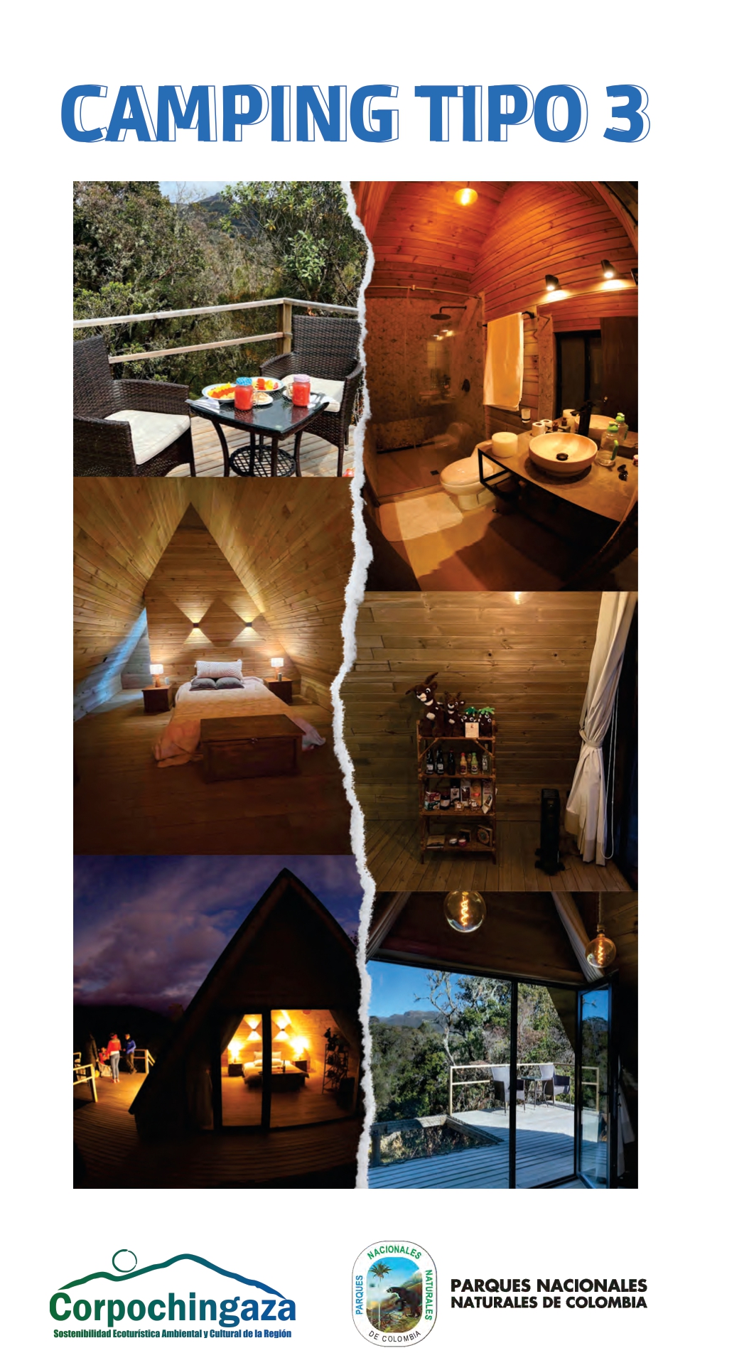 El camping tipo 3, cuenta con una infraestructura amigable con el ambiente, tomando en consideración que es liviana, proporciona comodidad debido a la cama, iluminación y calidez, así mismo, dispone de un baño privado.