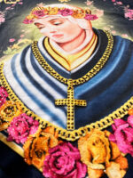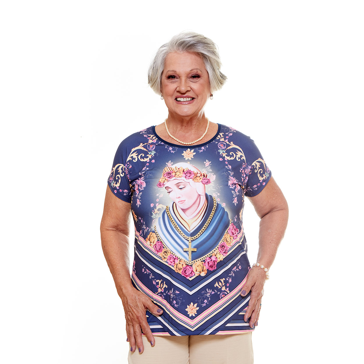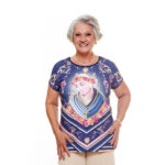 Preciosa blusa de Nuestra Señora de la Salette en color azul, con tejido de poli elastano y viscolycra, muy cómoda. Es una pieza que impresiona por su significado y devoción en la que Nuestra Señora de la Salette, con sus lágrimas de amor, ruega a sus hijos que se arrepientan de sus pecados y busquen la oración para unirse cada vez más a Jesucristo, único Salvador.