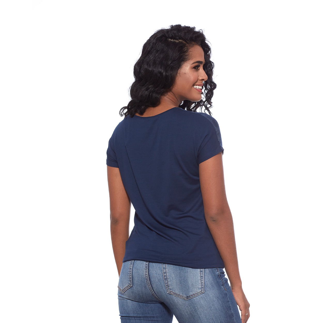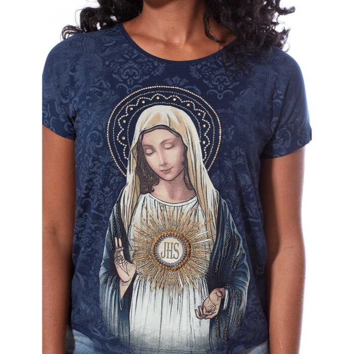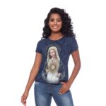 Camiseta Nuestra Señora Custodia con detalles exclusivos para esta pieza en precioso color azul oscuro en tejido vortex y viscolycra, textura muy cómoda y suave. Perfecto para que las mujeres católicas lo usen e inspiren las virtudes de María a todos los que las rodean.