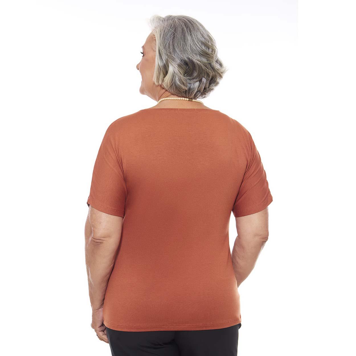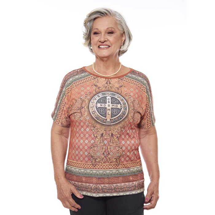 Hermosa blusa para dama de la Medalla de San Benito, con un tejido muy cómodo y suave, en color anaranjado, con detalles especiales que adornan la imagen de la Medalla San Benito. Adecuado para usar en todas partes, incluso en fiestas y solemnidades, recordándonos que a través de la intercesión de San Benito se pueden lograr muchas gracias.