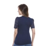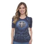 Blusa de la Medalla San Benito con un hermoso diseño de la poderosa medalla para llevar con devoción y ser signo de fe donde quiera que vayas. En color azul marino, en tejido suave y textura lisa con diseño en sublimación y aplicación de pedrería aportando un bonito efecto luminoso a la pieza.
