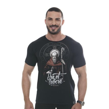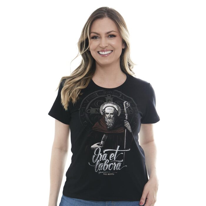 Camiseta para mujer de San Benito con diseño en aplicación de silk, exaltando la pieza y dándole un aspecto más elegante y sofisticado. Camiseta con diseño de San Benito en color negro, 100% algodón suave y confortable, con detalles que realzan la imagen y producen el diferencial de la prenda. Disponible también en versión masculina para lucir en pareja.