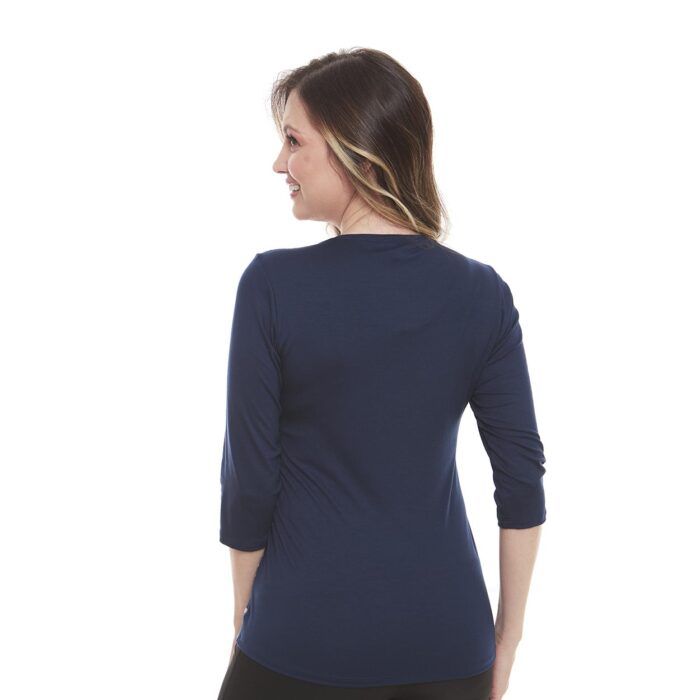 Blusa de la Virgen de la Medalla Milagrosa con manga ¾, en color azul marino en tejido vortex y viscolycra muy cómoda de textura ligera y suave al tacto. Blusa de Nuestra Señora de la Medalla Milagrosa con una bella imagen de la Virgen María y la Medalla Milagrosa con modernos detalles, perfecta para lucir en las más diversas ocasiones.