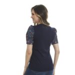 Camiseta de Nuestra Señora de Fátima con un precioso diseño adornado con flores por toda la prenda. En azul marino, para inspirar el cielo, es una pieza romántica y delicada con un diseño de Nuestra Señora de Fátima y los tres pastorcitos, con un detalle de manga de princesa especial para esta pieza. Camiseta para vestir como madre como hija y sentirte querida en todo momento de la vida. Disponible en versión infantil.