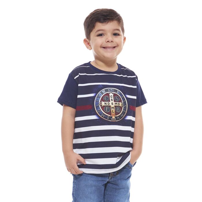 Camiseta de rayas en azul oscuro con la imagen de la Medalla de San Benito en el centro. Su modelado y corte dan un ajuste perfecto al cuerpo. Es perfecta para hacer varias combinaciones y vestir a toda la familia con mucho amor, además es unisex, tus niños podrán lucir maravillosos.