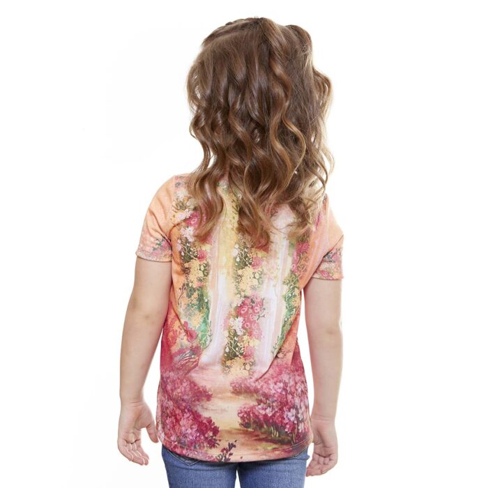 Camiseta infantil con imagen de Santa Teresita, en color caramelo. Es un diseño exclusivo y original de Ágape. Su tejido de polielastano es muy fresco y práctico, y tiene unos hermosos detalles de flores en la parte delantera y trasera