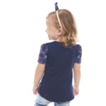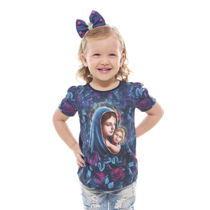 Camiseta Infantil tipo T-Shirt de la Madre de la Divina Gracia, en color azul oscuro con mangas de estilo romántico para niñas delicadas que aman expresar su devoción a la Virgen María.