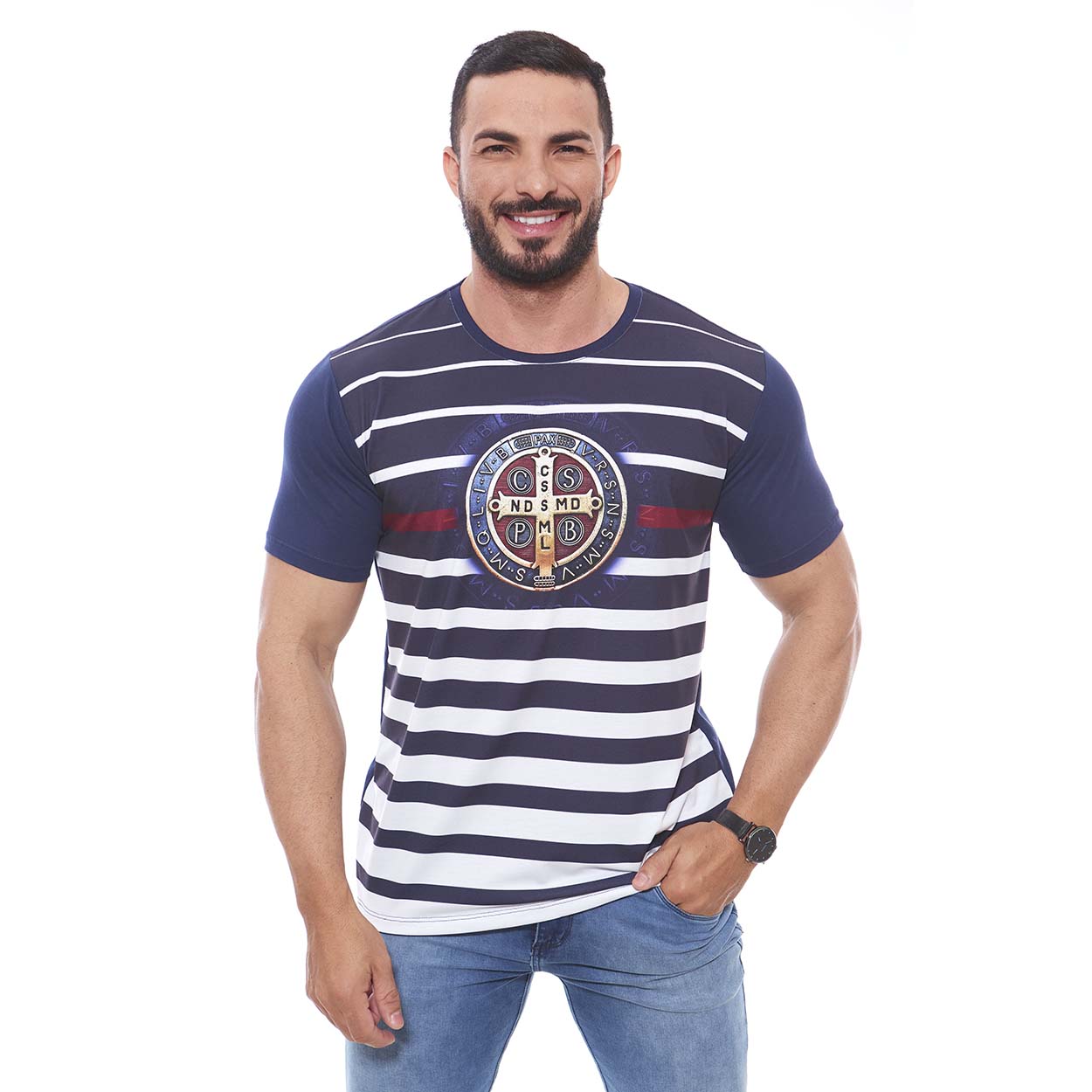 Camiseta Masculina de rayas claras con la Medalla de San Benito