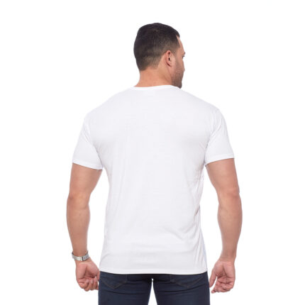 Camiseta para hombre de la Medalla San Benito en precioso diseño, en color blanco con lineas en azul claro, en tejido de polielastano, con ajuste perfecto para cualquier tipo de cuerpo, en cuello O. Camiseta Medalla San Benito con diseño moderno, que combina bien con cualquier look, para llevar con devoción y sentirse acogido por la poderosa Medalla de San Benito. Disponible en versión masculina y femenina para vestir en pareja.