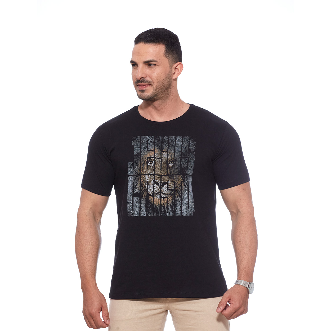 Con el mensaje “Jesucristo” esta camiseta es la prenda perfecta para lucir en los momentos más especiales. Con tejido suave y cómodo en color negro con un bonito detalle de seda creando un efecto único e iluminado en esta pieza.