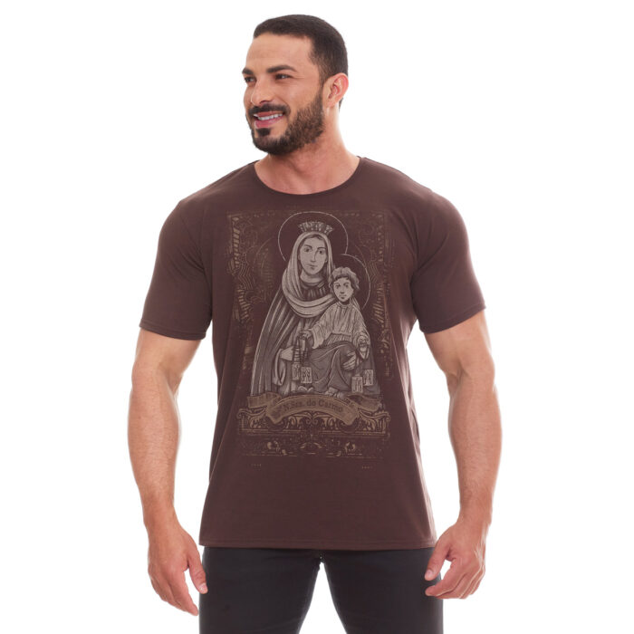 La camiseta de Nuestra Señora del Carmen es una pieza muy querida por todos aquellos que son devotos y reconocen el gran poder del Santo Escapulario de Nuestra Señora del Carmen. Pieza muy elegante en tejido suave y confortable, en color café, con detalles en silk, dando un efecto especial al diseño de Nuestra Señora con el Escapulario en sus manos.