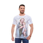 Camiseta para hombre con la imagen de San José en tejido de polielastano con textura suave y cómoda, en color blanco, perfecta para todo tipo de cuerpo. Es una camiseta con una imagen exclusiva de San José, custodio de Jesús y verdadero hombre de fe, es para vestir y vivir siempre las virtudes que conducen al amor perfecto de Dios Padre.