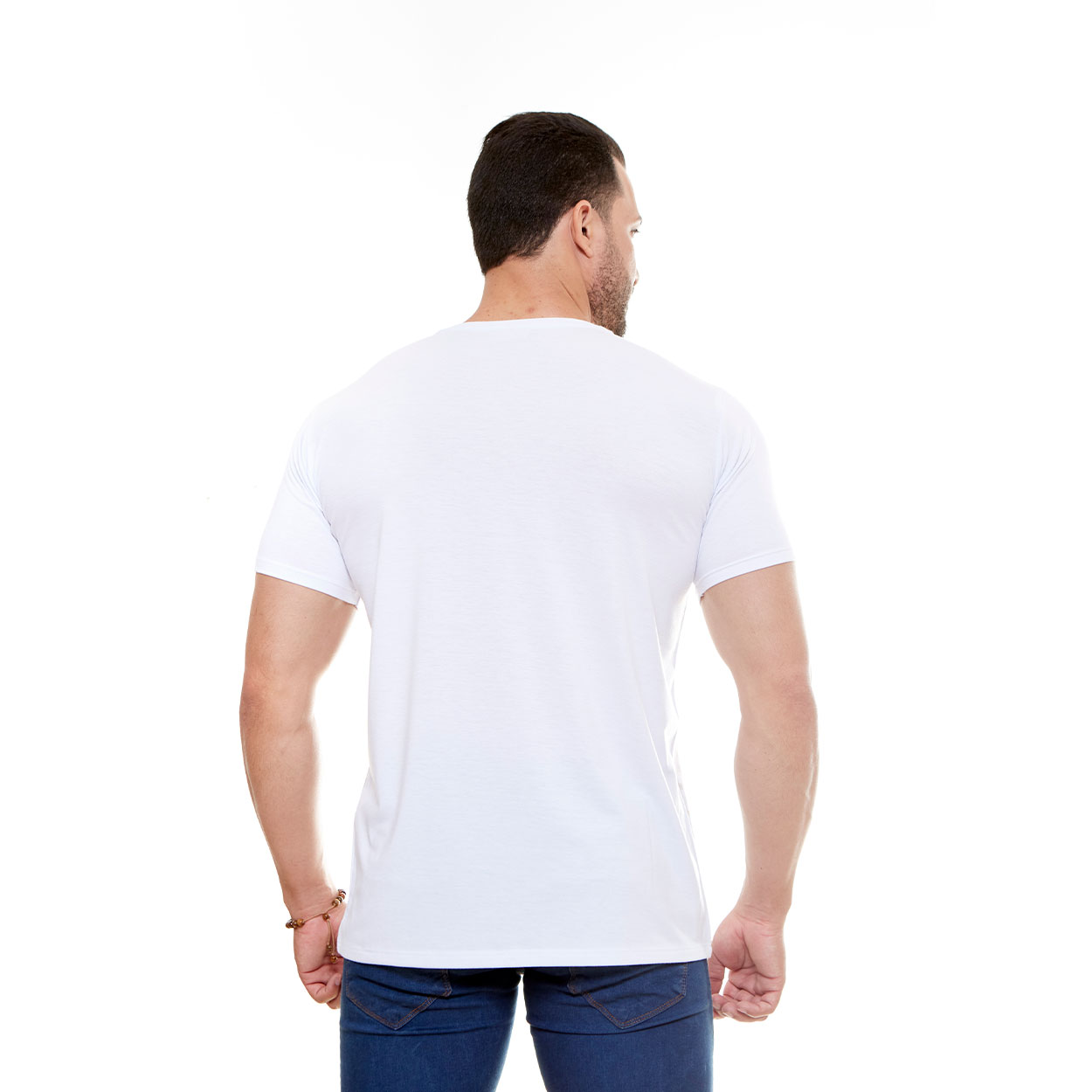 Camiseta para hombre de la Medalla San Benito en precioso diseño, en color blanco con lineas en azul claro, en tejido de polielastano, con ajuste perfecto para cualquier tipo de cuerpo, en cuello O. Camiseta Medalla San Benito con diseño moderno, que combina bien con cualquier look, para llevar con devoción y sentirse acogido por la poderosa Medalla de San Benito. Disponible en versión masculina y femenina para vestir en pareja.