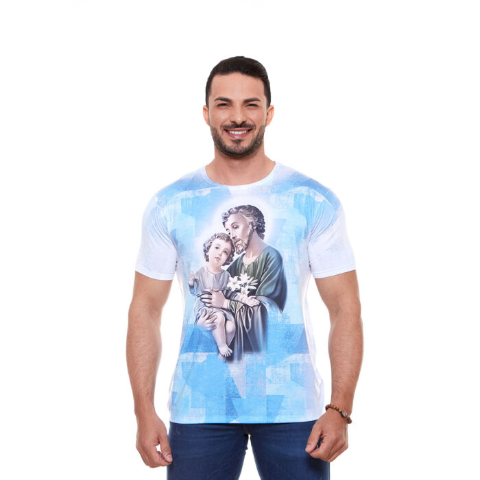 Camiseta con la imagen de San José en tejido de polielastano muy suave y confortable de textura lisa en color blanco con azul cielo. Con el Niño Jesús en su regazo, San José ha sido especialmente diseñado en esta camiseta para lucir en todo momento del día a día en honor al Guardián del Redentor, esposo de María y Patrono de la Iglesia.