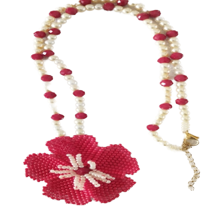 Collar elaborado a mano en perlas y murano, flor en mostacilla checa, terminales en acero.