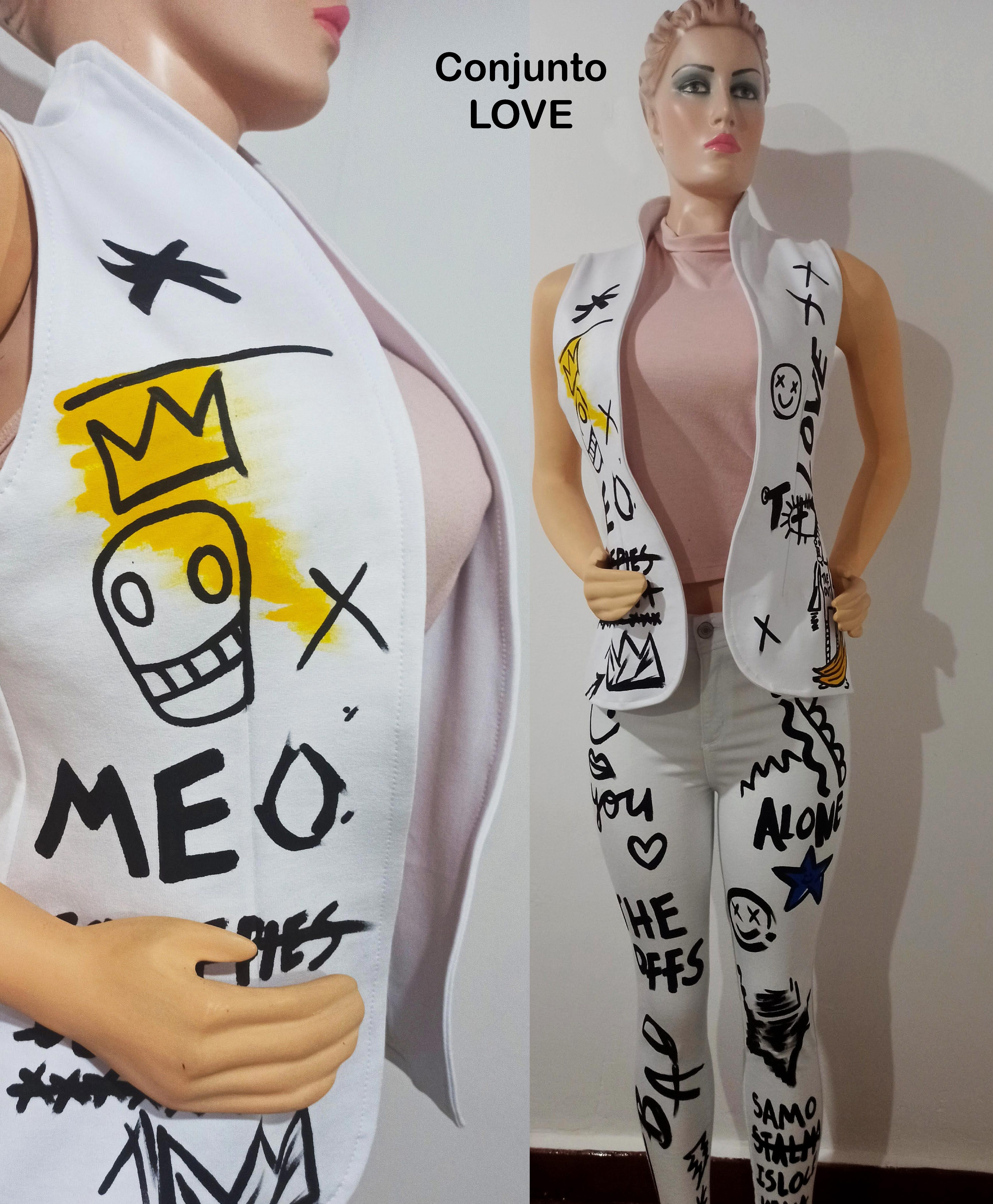 Conjunto de pantalón en drill, ajustado y entubado. Chaleco en drill, largo y suelto con ilustraciones elaboradas a mano.