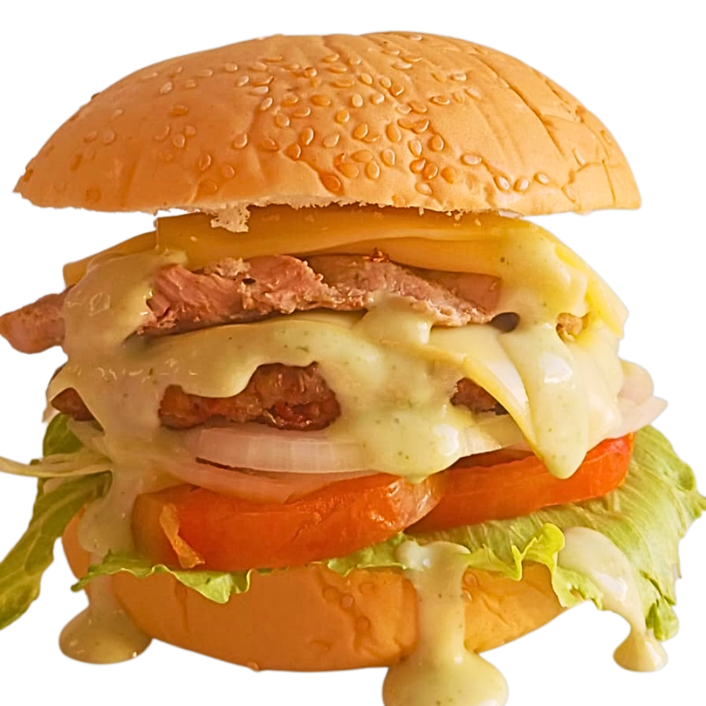 Esta deliciosa hamburguesa especial viene con una porción de carne artesanal y una porción de pechuga de pollo cada una de 125 gr, precocidas y asadas, pan con ajonjolí, lechuga, tomate, cebolla blanca, queso doble crema, papa ripio, nuestras salsas: tártara, de tomate y de piña. Adicionalmente está acompañada por una porción de de papas a la francesa.