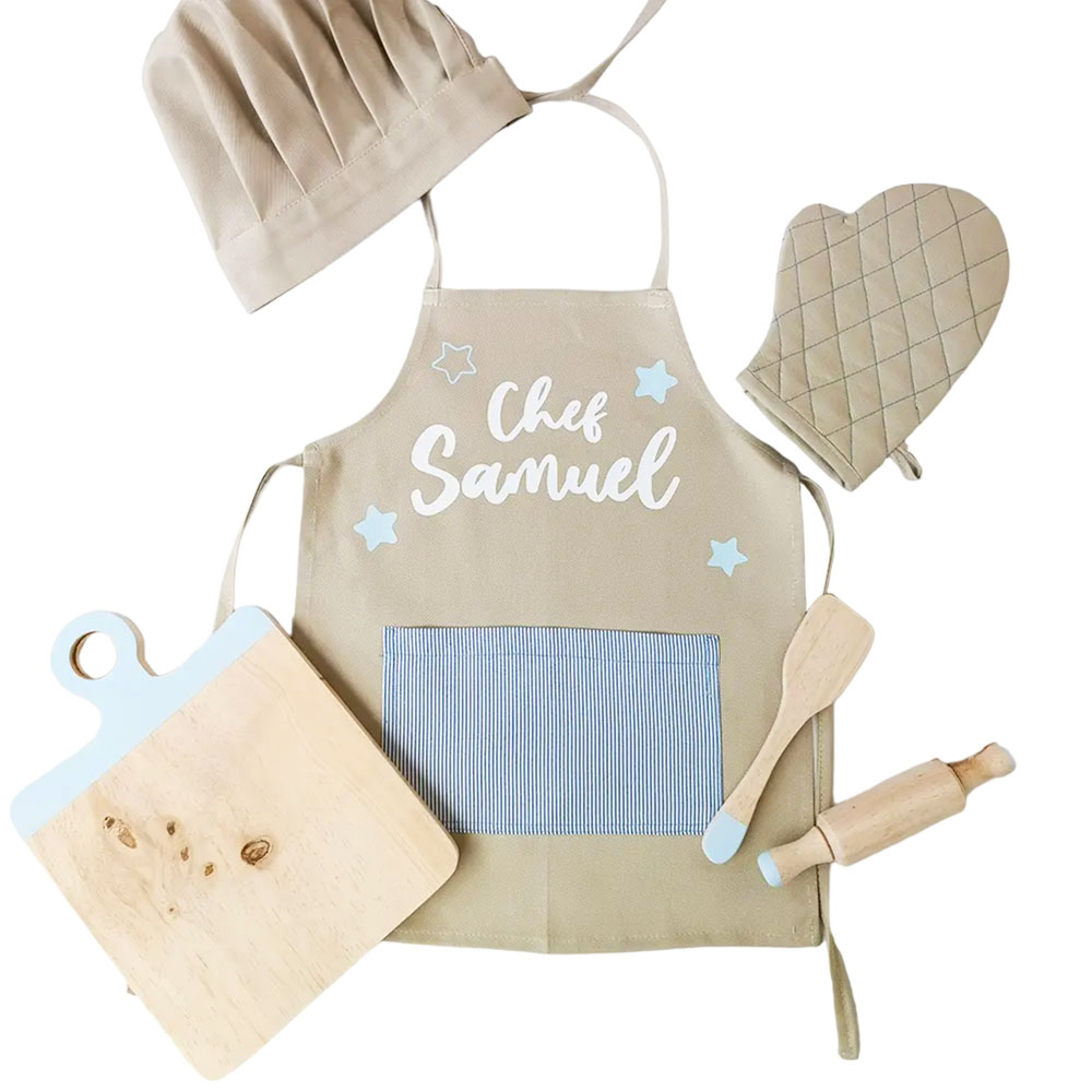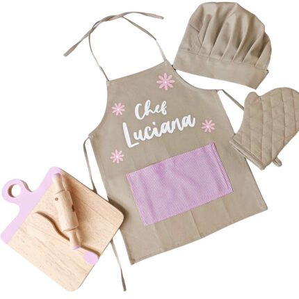 Kit de chef niño es ideal para desarrollar la creatividad y curiosidad de la cocina; con su uniforme y sus accesorios de madera podrá participar de las preparaciones y recetas como una profesional.