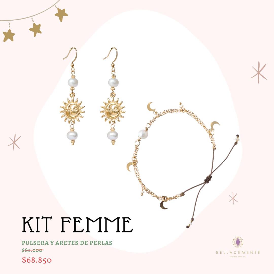 Pulsera y aretes de Perlas en goldfilled con motivo de luna y sol.
