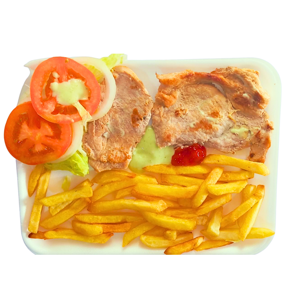 Deléitese con 200 gr de carne de cerdo pulpa y asada acompañada de 200 gr de papa a la francesa, ensalada de tomate, cebolla blanca y lechuga y nuestras salsas: tártara y de tomate.