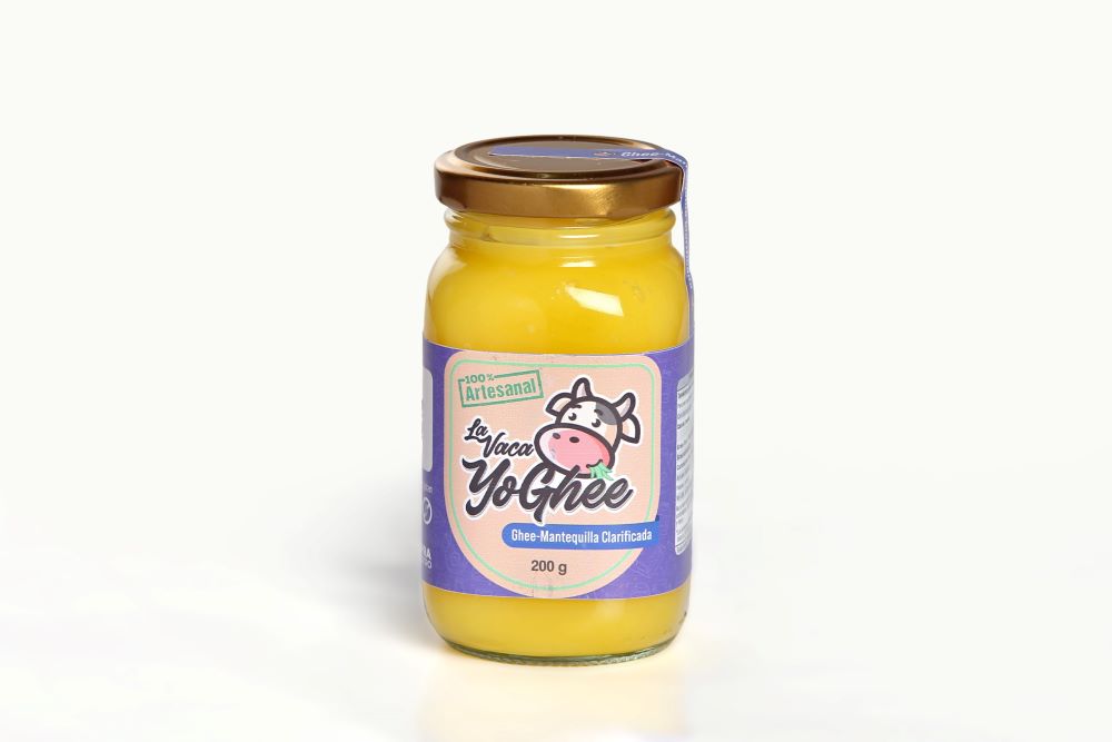 Mantequilla de vaca clarificada, ghee. Ideal para fritar, asar, hornear, cocinar y untar. Empacada en envase de vidrio con tapa metálica.