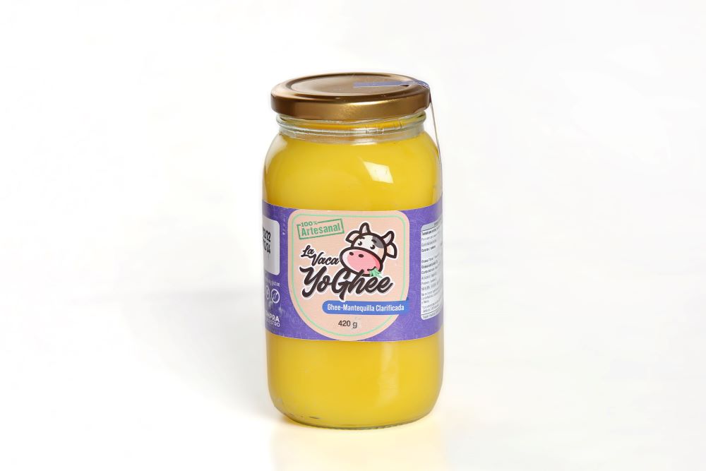 Mantequilla de vaca clarificada, ghee. Ideal para fritar, asar, hornear, cocinar y untar. Empacada en envase de vidrio