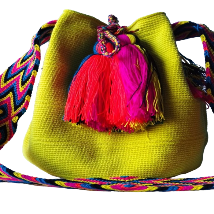 Elabora a mano en hilo guajira, unicolor amarilla, assas hechas en telar en colores surtidos.
