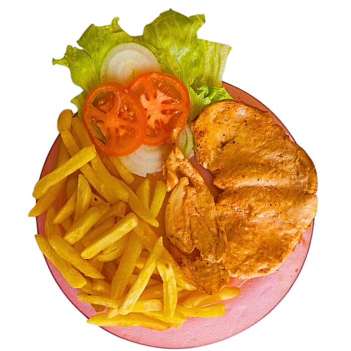 Este delicioso plato se compone de 200 gr de filete de pechuga asada, 200 gr de papa a la francesa, ensalada de tomate, cebolla blanca y lechugas y nuestras salsas: tártara y de tomate.