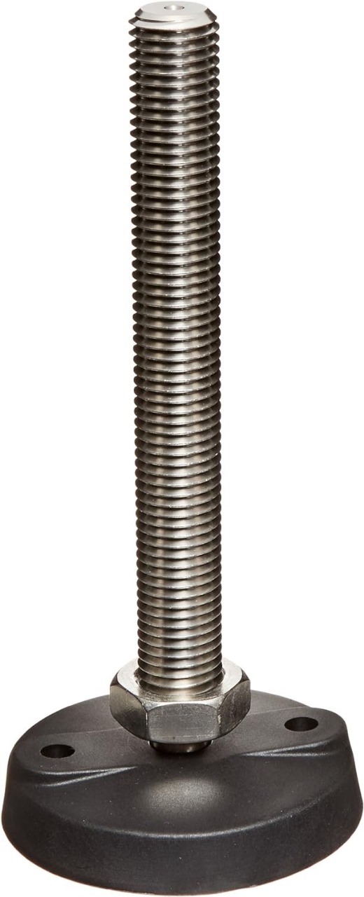 Pie nivelador rotulable, base plástica Ø 80 mm con perforaciones para anclar al suelo, tornillo en acero inoxidable rosca M20 x 203 mm longitud, con contratuerca de ajuste.