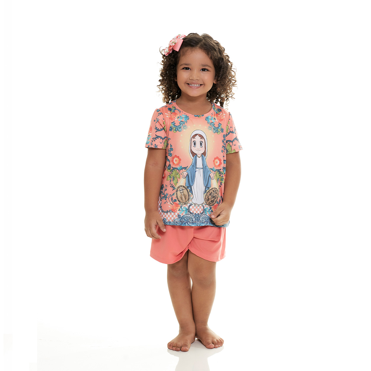 La imagen de la Virgen de la Medalla Milagrosa en estas pijamas infantiles están dedicadas a los más pequeños amantes de la Señora de la Medalla Milagrosa. Con una ilustración original de Ágape para usar y soñar en el regazo de la madre, muy cómoda y suave en tejido de microfibra. Ilustración exclusiva con preciosos arabescos en la parte delantera y trasera con camiseta y pantalón corto color salmón que forman el conjunto perfecto.