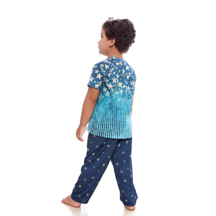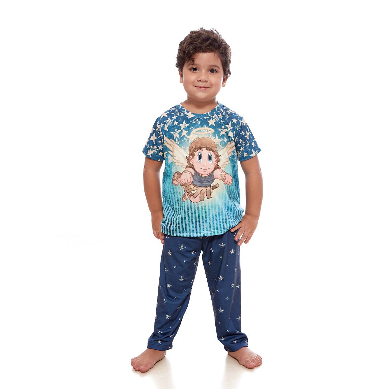 Pijama infantil de pantalón largo con imagen de San Miguelito para niños que han aprendido desde pequeños que pueden contar con la intercesión de sus amiguitos en el cielo. En esta pieza gana el titulo de San Miguelito componiendo un precioso conjunto de camiseta y pantalón largo para noches mas abrigadas.