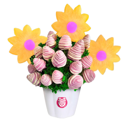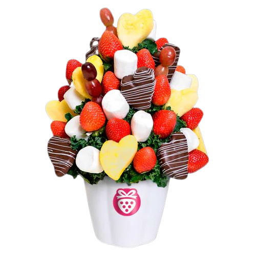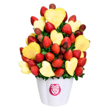 Ramo Frutal con Deliciosas Fresas Naturales, Corazones de Piña Naturales, Corazones de Piña cubiertas de chocolate con líneas de chocolate blanco, Marshamallows, Palitos de Uvas.
