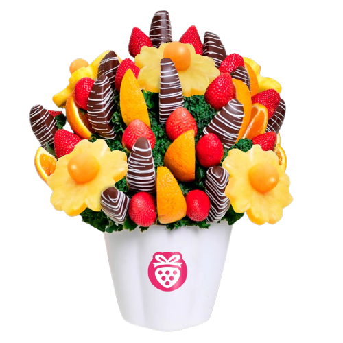 Ramo Frutal con Deliciosas Fresas naturales, Flores de Piña, Esferas de Melón de centro de la flor, gajos de manzana verde cubiertas de chocolate clásico, gajos de naranja.