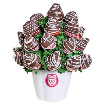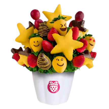 Ramo Frutal con Deliciosas Fresas Naturales, Fresas en chocolate decoradas con chocolate figuras de emoji Amor, corazones de Piña natural.