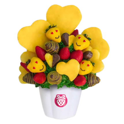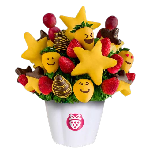 Ramo Frutal con Deliciosas Fresas Naturales, Frersas en chocolate deocradas con chocolate figurasd de emoji, Estrellas de Piña natural, Palitos de Uvas.
