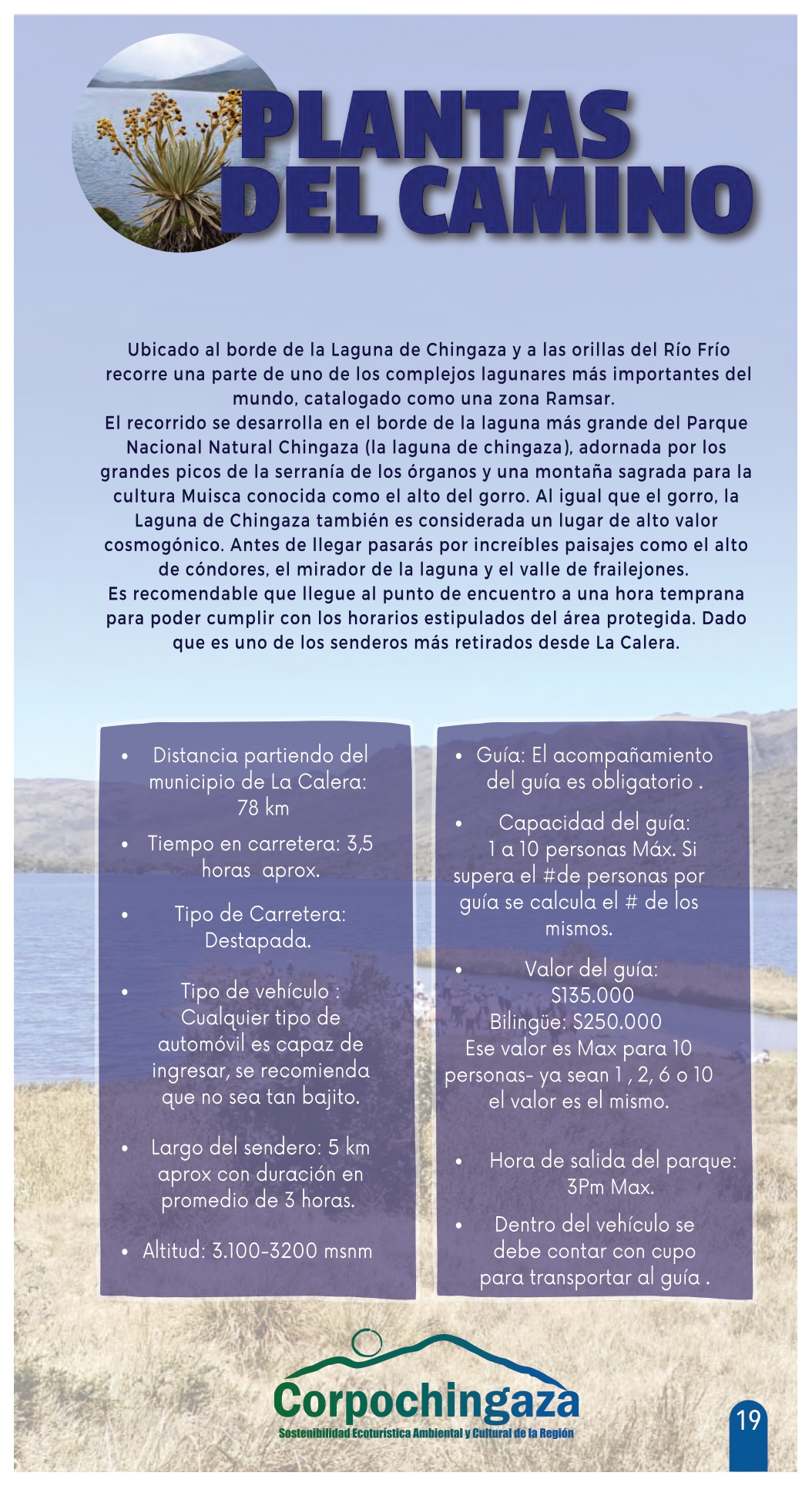 El recorrido se desarrolla en el borde de la Laguna de Chingaza, la más grande del Parque Nacional Natural Chingaza, adornada por los grandes picos de la serranía de los órganos y una montaña sagrada conocida como el alto del gorro.