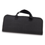 Set de BBQ con 3 utensilios metálicos y en madera (pinzas, trinche, cuchillo), tabla y guante. Estuche en lona con cierre de cremallera.