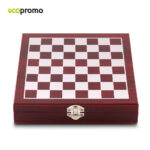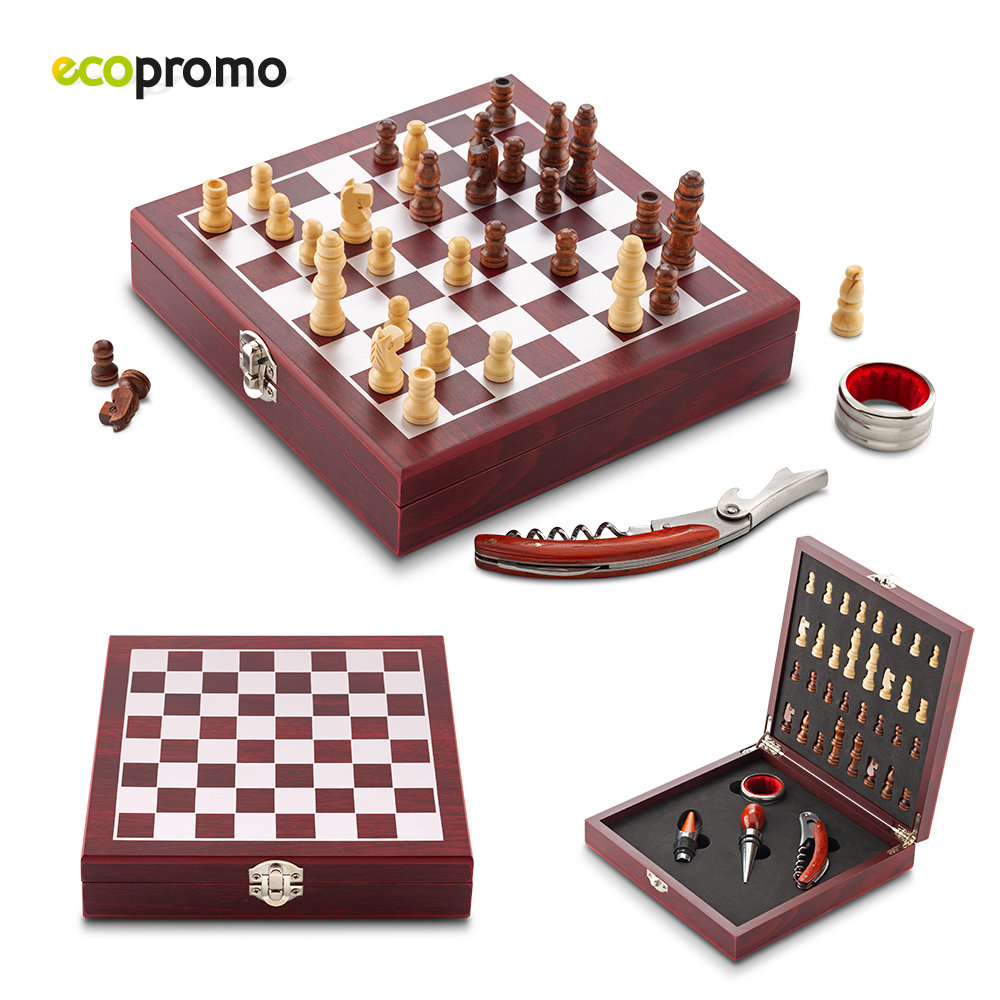 Set de vino en estuche en madera, 4 accesorios: dosificador, corcho, descorchador y argolla antigoteo. Incluye juego de ajedrez en madera lacada. Empaque caja individual.