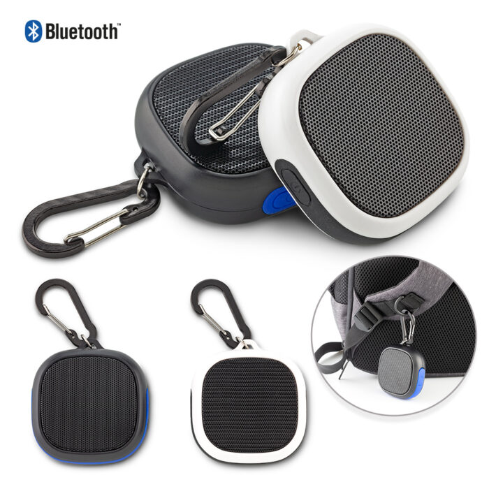 Speaker Bluetooth plástico de 3W con carabinero. Empaque caja individual. Medidas: 6.5 cm x 6.7 cm x 2.5 cm . Marca: 4 cm / Tampografía