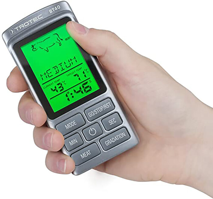 El BT40, de uso manual, se puede utilizar cómodamente en barbacoas, cocinas y hornos. Al introducir la punta de medición en el alimento, la estación base conectada al sensor de medición de temperatura comienza a transferir, regularmente y en señales cortas, el valor real de temperatura de la carne al mando receptor, el cual emite una señal acústica y cambia el color de la pantalla una vez alcanzado el punto de cocinado de la carne que se haya configurado.
