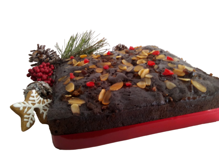 Torta de vino , con fruta macerada en vino, frutos secos, naranja confitada, brevas.