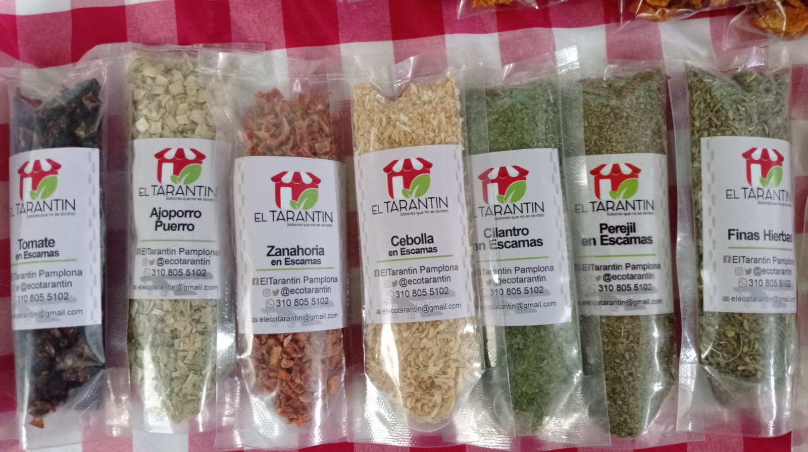 Ajo – Cebolla – Zanahoria – Perejil – Cilantro – Puerro – Apio – Tomate – Tomillo – Páprika – Cúrcuma – Jengibre – Orégano – Eneldo – Estragón – Albahaca – Menta – Romero – Orégano – Canela – Finas Hierbas – Fenogreco – Ají dulce –